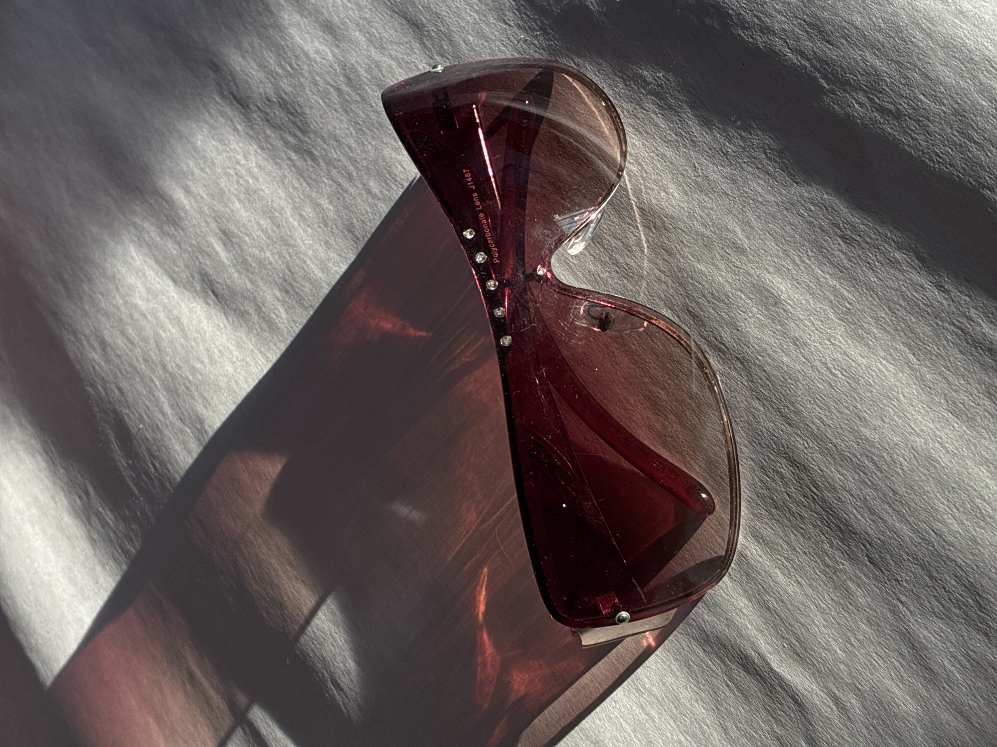 A pair of rimless shield-style sunglasses with gradient lenses is positioned on a light-colored, textured, and wrinkled surface. The lenses transition from a dark, translucent red or burgundy at the top to a lighter, more transparent brown or amber at the bottom. Six small, clear rhinestones are set along the upper edge of the frame, above the nose bridge. Two silver-colored studs are visible on the exterior sides where the temples would attach. White text "Polycarbonate Lens J1487" is printed on the upper right lens. Minor scratches and dust are visible on the lens surfaces. Strong, directional natural light illuminates the scene from the upper left, casting a prominent, dark shadow across the lower right portion of the surface. Reddish light refractions are visible on the wrinkled surface, particularly within the shadowed areas, indicating sunlight passing through the tinted lenses. The scene is situated in New York, United States of America.