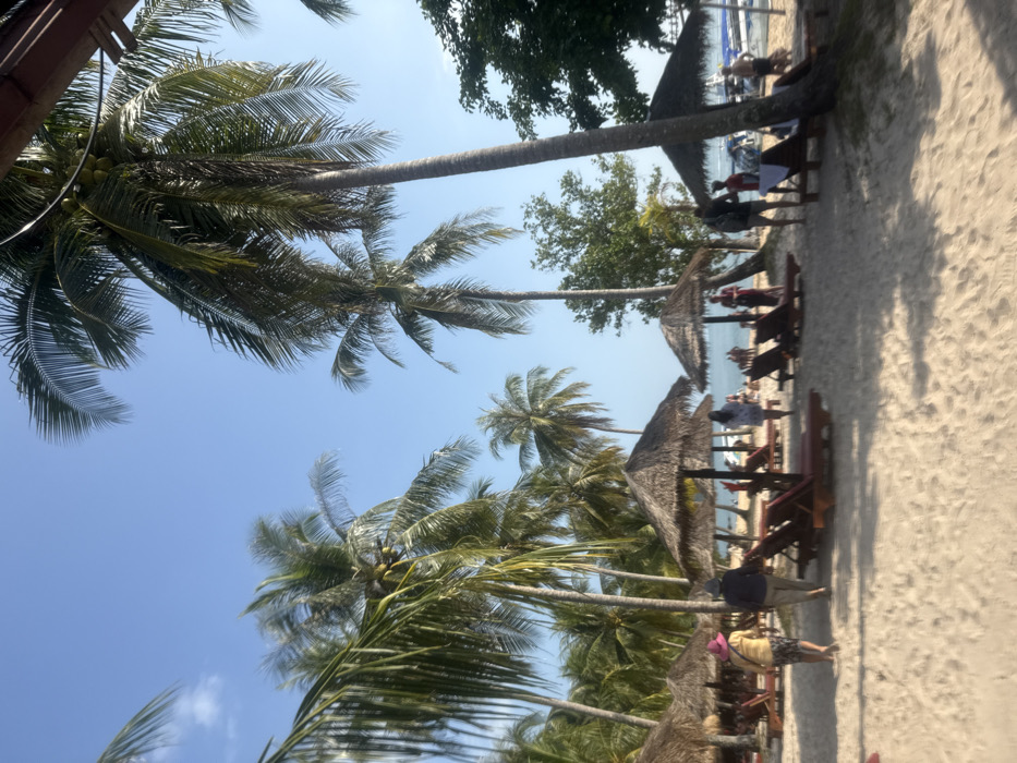 This image depicts a beach environment at Ban Khlong Hia, Thailand. The scene features a sandy shore under a clear blue sky with minimal cloud cover. Numerous tall palm trees with green fronds and visible coconuts are dispersed throughout the frame, casting shadows on the sand. In the mid-ground, six thatched beach umbrellas are arranged, each accompanied by multiple wooden lounge chairs fitted with dark red cushions. Approximately 15 individuals are present on the beach. In the left foreground, two individuals walk away from the viewer; one wears a yellow top and a pink wide-brimmed hat, the other a dark top and light trousers. Towards the center-left, a person in a light-colored garment walks towards the water. On the right mid-ground, several individuals are gathered near the water's edge; one person in a dark shirt and shorts with a backpack stands near another in a red shirt. Other individuals are indistinctly visible closer to the water. The background shows a calm body of water, likely the sea, with several small boats partially visible near the shoreline on the right. Additional green foliage is present behind the beach umbrellas. Utility wires are partially visible in the upper right section of the image. The scene is illuminated by bright daylight.