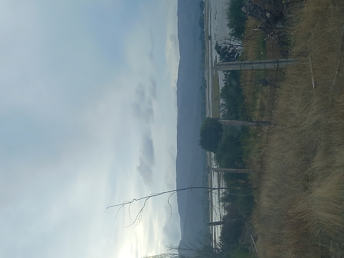 A hazy landscape featuring mountains in the background. A body of water reflects the sky. A barbed wire fence bisects the scene, running horizontally across the lower portion. Tall, dry grass dominates the foreground, while sparse trees and shrubs are visible beyond the fence. The sky is overcast, with a mix of clouds and bright areas. A bare tree branch reaches into the sky from the lower left corner.