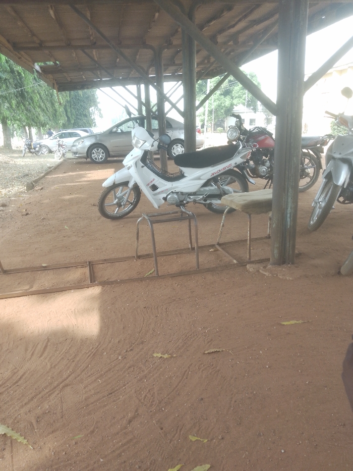 The image displays an outdoor scene in Idah, Nigeria, under a wooden canopy structure. The ground is composed of reddish-brown dirt, showing various tire marks and scattered light-colored debris with a few fallen pale green leaves. In the foreground, a light-colored wooden stool with an upholstered seat rests next to one of the canopy's substantial wooden support posts. Adjacent to the stool, a rectangular metal framework, possibly a bicycle rack, is positioned on the ground. A prominent white JINGHENG brand motorcycle is parked in the midground, oriented towards the left. Behind this motorcycle, a red motorcycle and a silver motorcycle are partially visible. Further in the background, two cars are parked: a silver sedan and a lighter-colored sedan. The background reveals numerous green trees and a light-colored building under a bright, overcast sky. No individuals are present in the visible area.