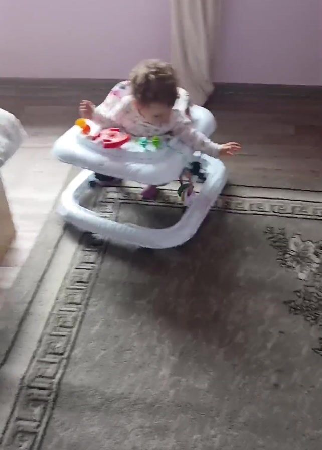 A short video shows a baby in a walker, with an eye-level angle of the baby at the end