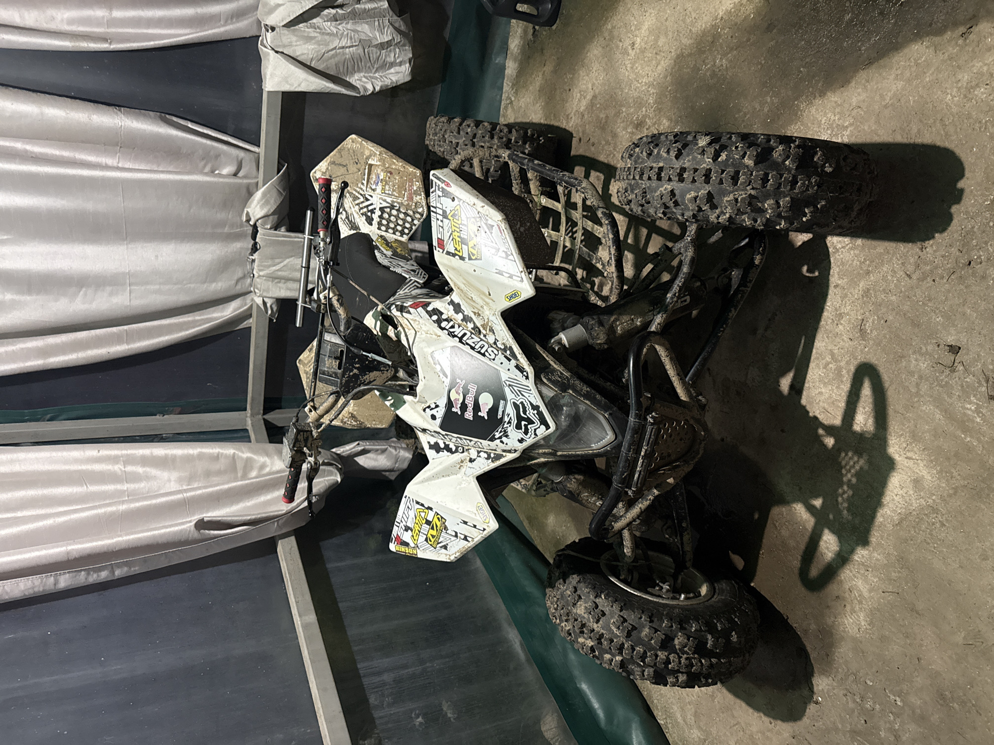 n overturned Suzuki all-terrain vehicle (ATV). The ATV is white with black and grey accents, covered in dirt and mud. The tires are heavily treaded and muddy. The ATV is located on a concrete surface, possibly a garage or storage area. There is a frame with draped material in the background. The environment appears dimly lit, with the ATV casting a shadow. The location is not discernible as Bazovets, Bulgaria, without additional information.