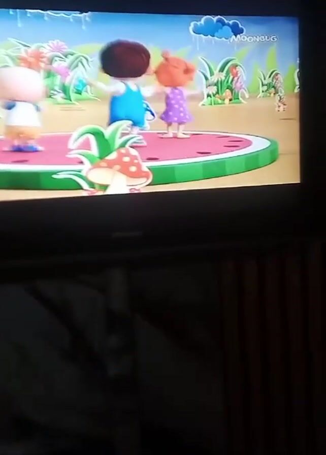 television displaying a cartoon. The cartoon features three animated children standing on a watermelon-shaped platform in a colorful, whimsical outdoor environment with flowers, mushrooms, and other greenery. One child has red hair in pigtails and is wearing a purple polka dot dress. Another child has light hair and is wearing a white shirt and blue overalls. The third child has brown hair and is wearing a white shirt and blue overalls. All three children are smiling and appear to be dancing or moving their arms. The logo "MOONBUG" is visible in the upper right corner of the screen. The television itself is a Samsung model. The background behind the television appears to be a wall with vertical wooden slats and a draped curtain.