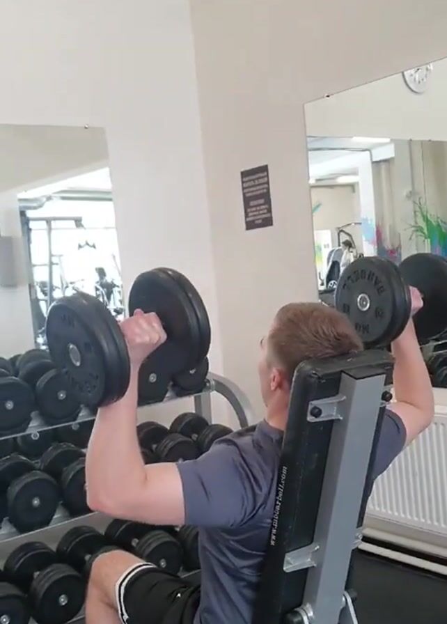 A man is doing dumbbell shoulder presses while sitting in an incline bench press
