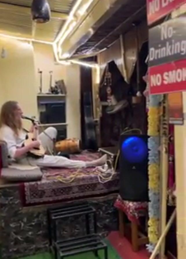 The video starts with a man sitting and playing guitar while singing into a microphone. He is in a corner with a platform covered in a rug. There are various instruments and equipment behind him. The camera then pans to a walkway with signs reading "NO LAPTOPS", "No-Drinking", and "NO SMOKING". People walk through the walkway, including those wearing saris. The camera reveals a group of people seated at tables outside, with a nighttime cityscape visible in the background. The area is decorated with colorful garlands and lights.