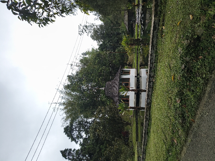 A white building with a thatched roof is nestled among lush green trees and vegetation. A body of water reflects the building and surrounding foliage. The image is taken from a slightly elevated position, showcasing the building's architecture. Power lines cross the upper left portion of the frame, contrasting with the natural setting. The sky is overcast.