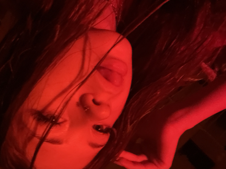 The image displays a close-up, angled view of a human face and a portion of a hand, bathed entirely in intense red light