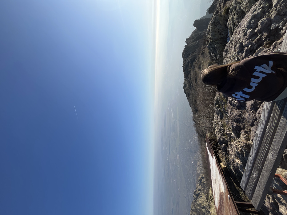 An individual with long, dark hair, viewed from behind, sits on a weathered wooden bench on a rocky mountain summit in Ichera, Bulgaria. The person wears a dark hooded sweatshirt with light-colored lettering, appearing to read "ftautz" or "iftutz" on the back. To the immediate left of the bench, a rusted metal structure with a flat, snow-dusted surface is present. The surrounding terrain consists of jagged rocks and sparse, bare vegetation. The scene overlooks a vast valley, hazy with atmospheric conditions, containing a distant urban or semi-urban area. The sky above is clear blue, with a single aircraft contrail visible in the upper central portion. Sunlight illuminates the scene, suggesting a clear day.