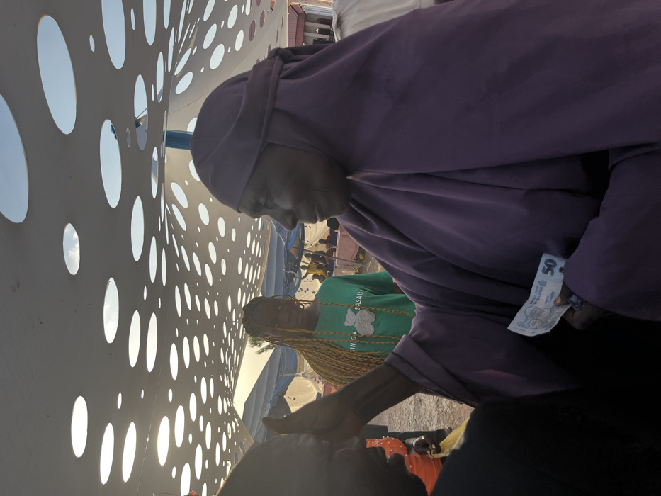The image depicts an outdoor scene in an unspecified city in Nigeria. In the foreground, an older woman with dark skin, wearing a purple headscarf and matching flowing garment, is positioned on the right, facing left. She holds a white 50 Nigerian Naira banknote in her right hand, positioned at waist level. Her left hand is raised towards the head of a partially visible person on the far left, whose dark-skinned profile and shoulder are visible. The older woman's facial expression suggests a slight smile. In the mid-ground, a younger woman with long blonde braided hair stands, wearing a green t-shirt with a white teddy bear logo and the text "UNION SASATAI" visible across the chest. She looks directly towards the camera or slightly left. Overhead, a large white canopy with numerous oval-shaped cutouts allows sunlight to filter through, creating dappled patterns. In the background, multiple blue and white temporary tents or canopies are visible, under which other individuals are faintly discernible. The ground appears to be unpaved earth. The overall lighting suggests an outdoor daytime setting.