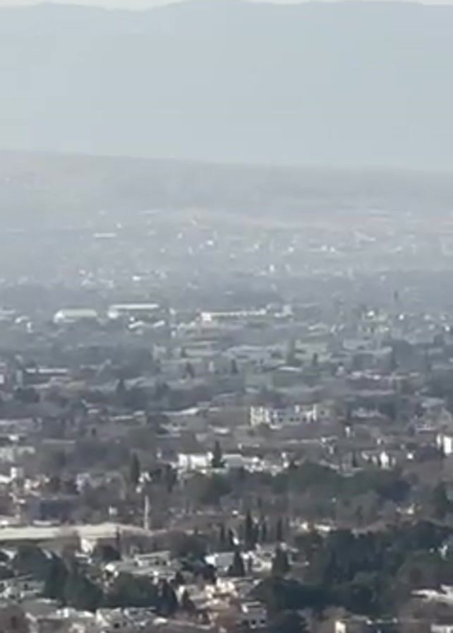 n aerial view of a cityscape, possibly taken from a hilltop or elevated vantage point. The city is densely populated with buildings and trees. In the background, mountains are visible on the horizon, obscured by a hazy atmosphere. The sky is pale. The second shot is a wider view of a sprawling desert landscape with city buildings in the distance and a blue sky with clouds above.