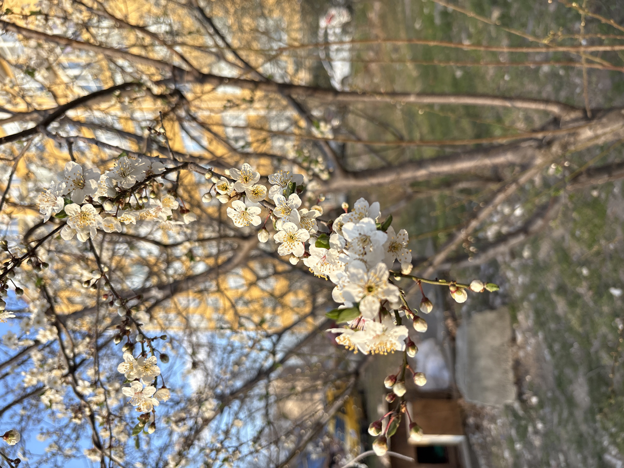 The image depicts a spring scene in Simferopol, Ukraine, focused on a blossoming deciduous tree. In the immediate foreground, a branch heavily laden with open white flowers and unopened buds is in sharp focus. Each flower displays five distinct white petals and a cluster of prominent yellow anthers. Behind this, the blurred network of bare tree branches and trunks extends towards the background. To the left of the frame, a segment of a small, rectangular wooden structure, possibly an animal shelter or storage box, is partially visible at ground level. Further into the blurred background on the left, a yellow vehicle is faintly discernible. On the right side of the background, a multi-story building with a warm, golden-yellow facade stands, its windows vertically oriented and indistinct due to motion blur or shallow depth of field. Another white vehicle is barely visible on the far right, also out of focus. The ground beneath the trees consists of sparse, dull green grass mixed with areas of bare soil and scattered light-colored debris. A rectangular concrete slab is partially visible on the ground near the wooden structure. Patches of clear blue sky are visible through the tree canopy. The scene is illuminated by natural light, suggesting daytime conditions, with a warm light source illuminating the distant building. No people are visible.