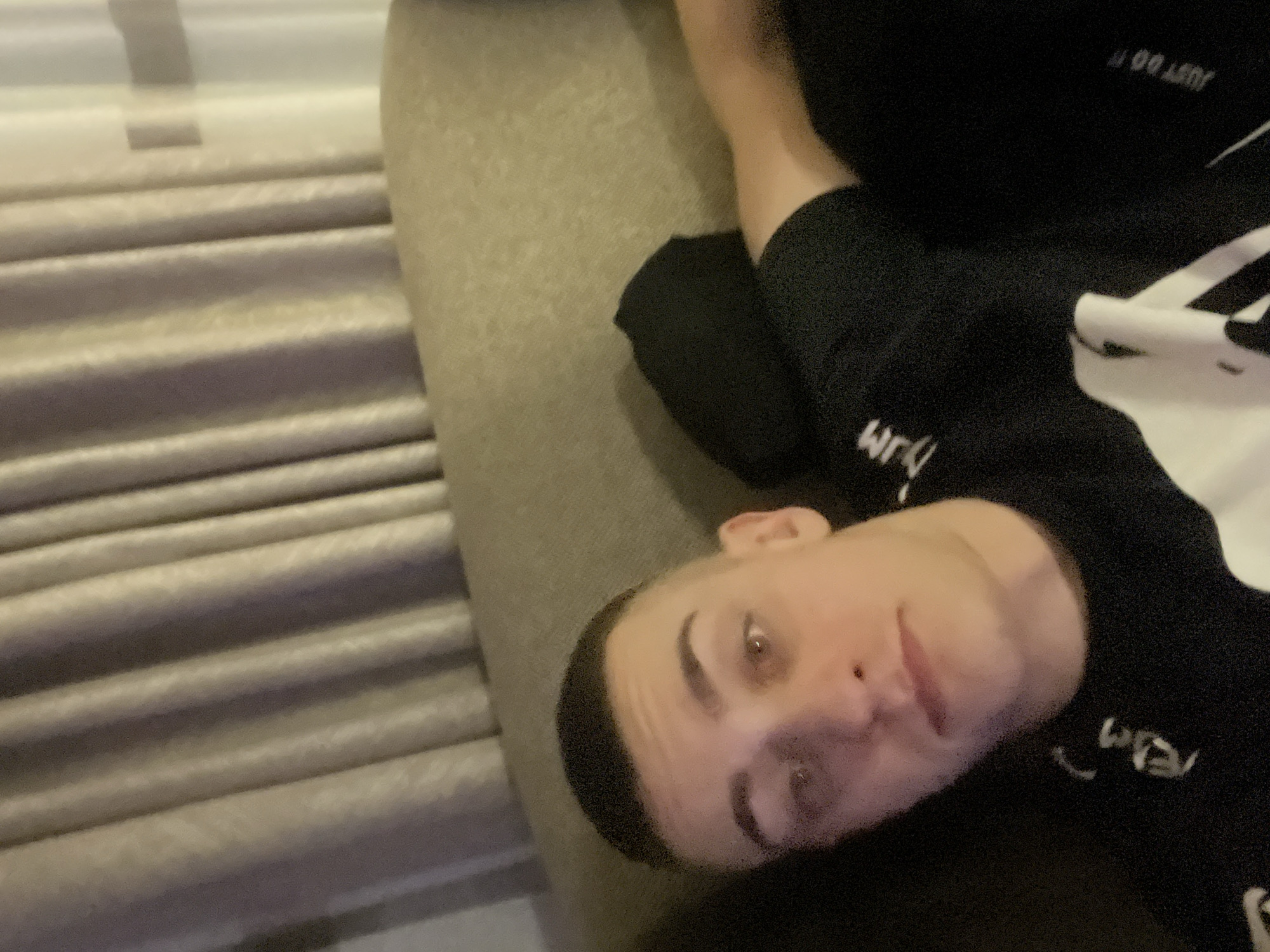 person lying on a sofa. The person has short dark hair and is wearing a black sweatshirt with white lettering and a design. Part of a curtain or blind is visible to the left. The location, Ahtopol, Bulgaria, cannot be determined from the provided image.