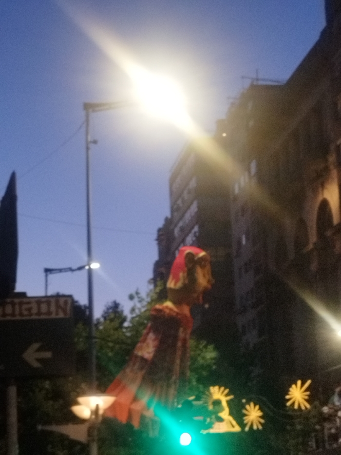 An outdoor nighttime shot focuses on a large, towering puppet figure with a red headdress and patterned garment. It stands near a street with green lights, illuminated decorative stars, and a street sign pointing left with "LOGION" visible. Buildings of varying heights rise in the background under a blue dusk sky pierced by bright streetlights. The scene feels like a parade or public performance.