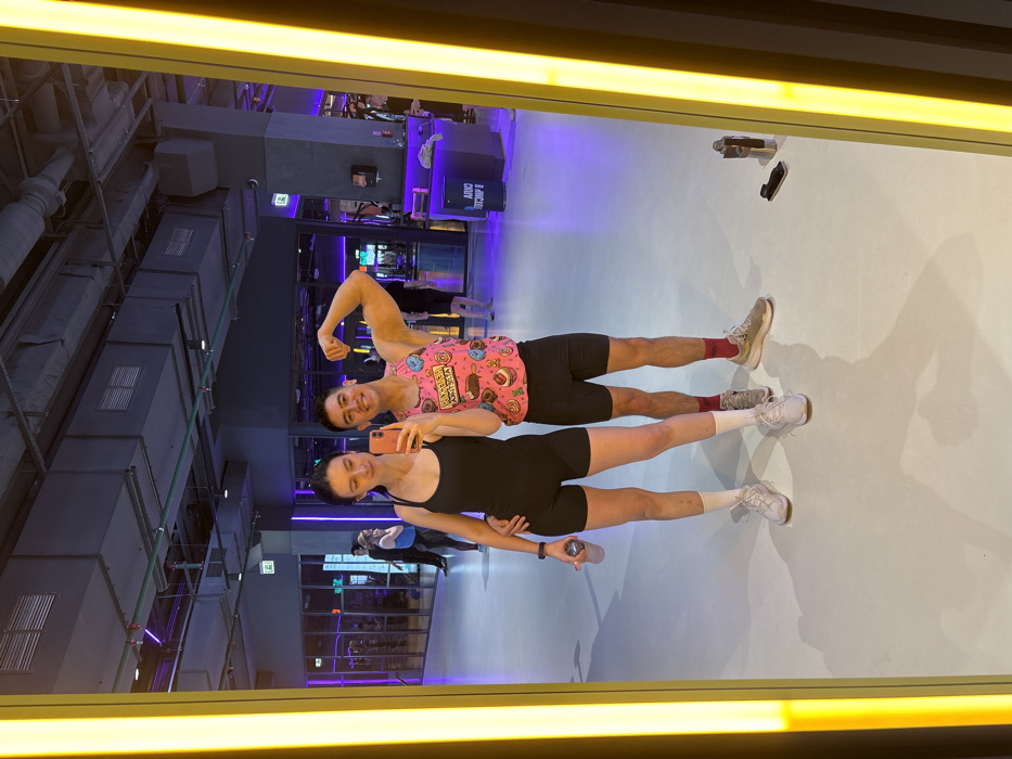 Two individuals are captured in a mirror selfie within a modern fitness facility in Kazan, Russia