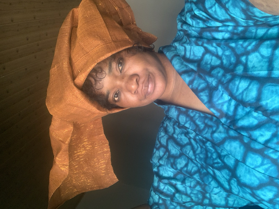 An adult Black female is depicted in a close-up, chest-up shot, looking directly at the camera with a slight, closed-lip smile. She wears a large, elaborate metallic orange or coppery headwrap (gele) with a textured, shimmering finish, styled prominently on her head. Her dark, curly hair is visible around her forehead. She is dressed in a teal or turquoise garment with a darker blue or black abstract pattern, featuring a V-neckline. The background is dimly lit, revealing a dark wall behind her and a wooden-paneled ceiling above, illuminated by indirect light. The scene is located in the city of Barakin Akawo, Nigeria.