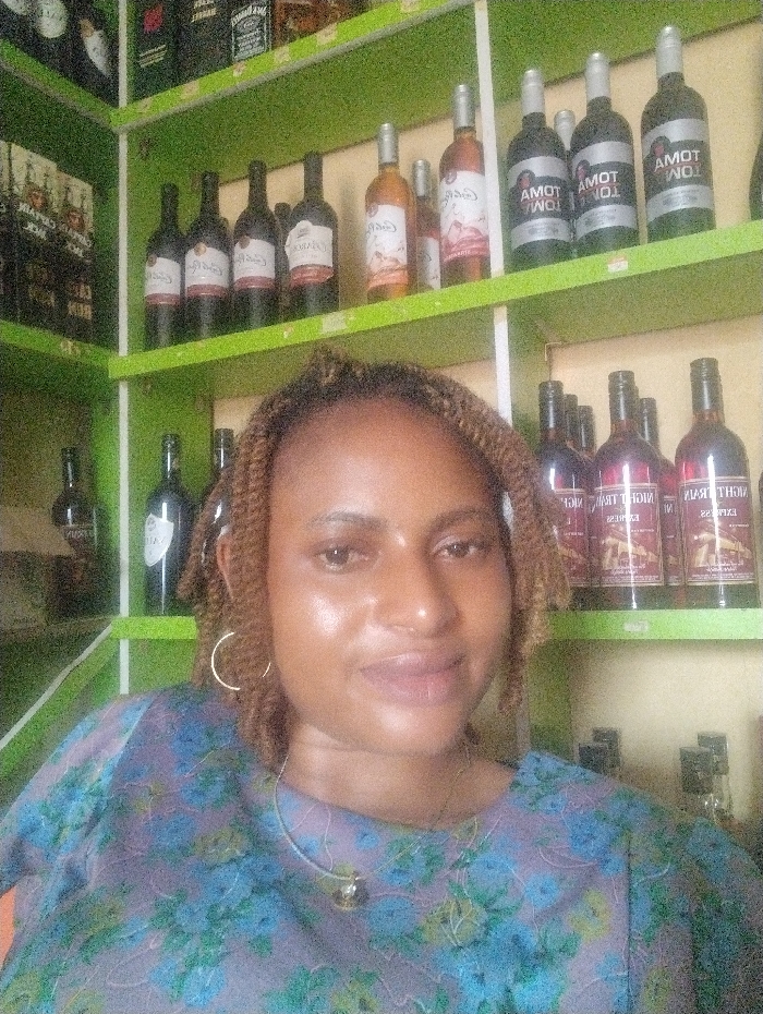 An adult female is depicted from the chest up, positioned centrally in an indoor retail setting characterized by green-painted wooden shelves stocked with bottled alcoholic beverages