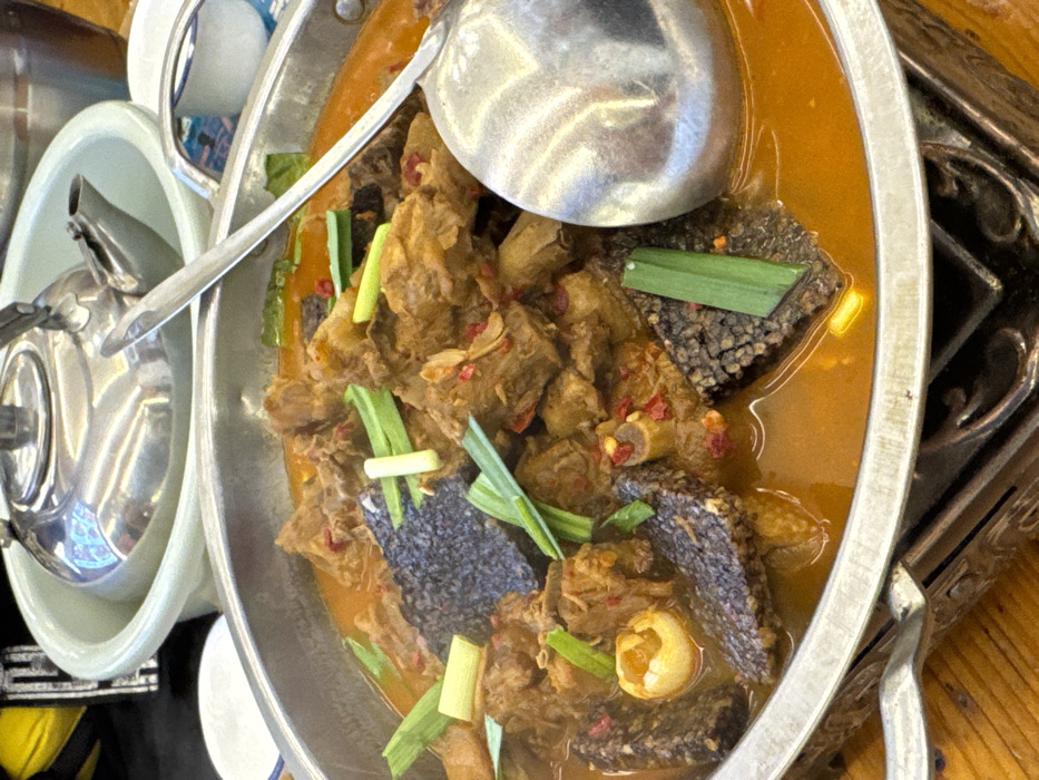 The image depicts an elevated view of a metal cooking pot brimming with a simmering stew, positioned on a dark, ornate metal stand on a light brown wooden table. The stew comprises irregular chunks of brown meat, dark, spongy, textured pieces (resembling blood tofu), and segments of green scallions, all immersed in a thick, orange-brown broth seasoned with red chili flakes. A single yellowish, ovoid object is visible within the stew on the left side. A large, reflective metal ladle is partially submerged on the right. In the blurred background, a light-colored basin holds a shiny metal teapot, positioned next to a smaller metal container and a white ceramic bowl with a blue rim. No individuals are present. The scene represents a prepared meal in Fenghuang, China.