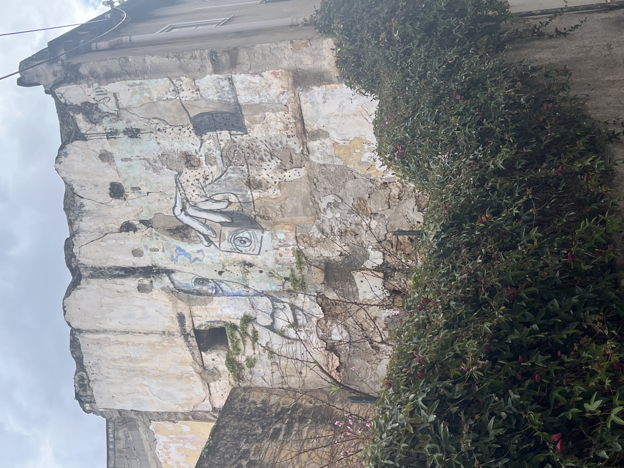 The image displays a severely dilapidated building wall in Palermo, Italy, under an overcast sky. The multi-story wall shows extensive structural deterioration, with significant portions of off-white and faded light blue plaster missing, revealing underlying brickwork and concrete. Numerous cracks traverse the remaining plaster. Street art is painted across the wall, featuring stylized human-like faces with prominent eyes and an elongated white hand motif. The letters "SID" are visible near the upper right corner of the wall. Creeping green vegetation, identified as ivy, adheres to sections of the damaged wall. In the immediate foreground, a dense hedge of dark green foliage with numerous dark red or magenta flower buds partially obscures the wall's base. Between the hedge and the wall, bare, thorny branches with sparse pink blossoms are visible. No individuals or active subjects are present in the scene.