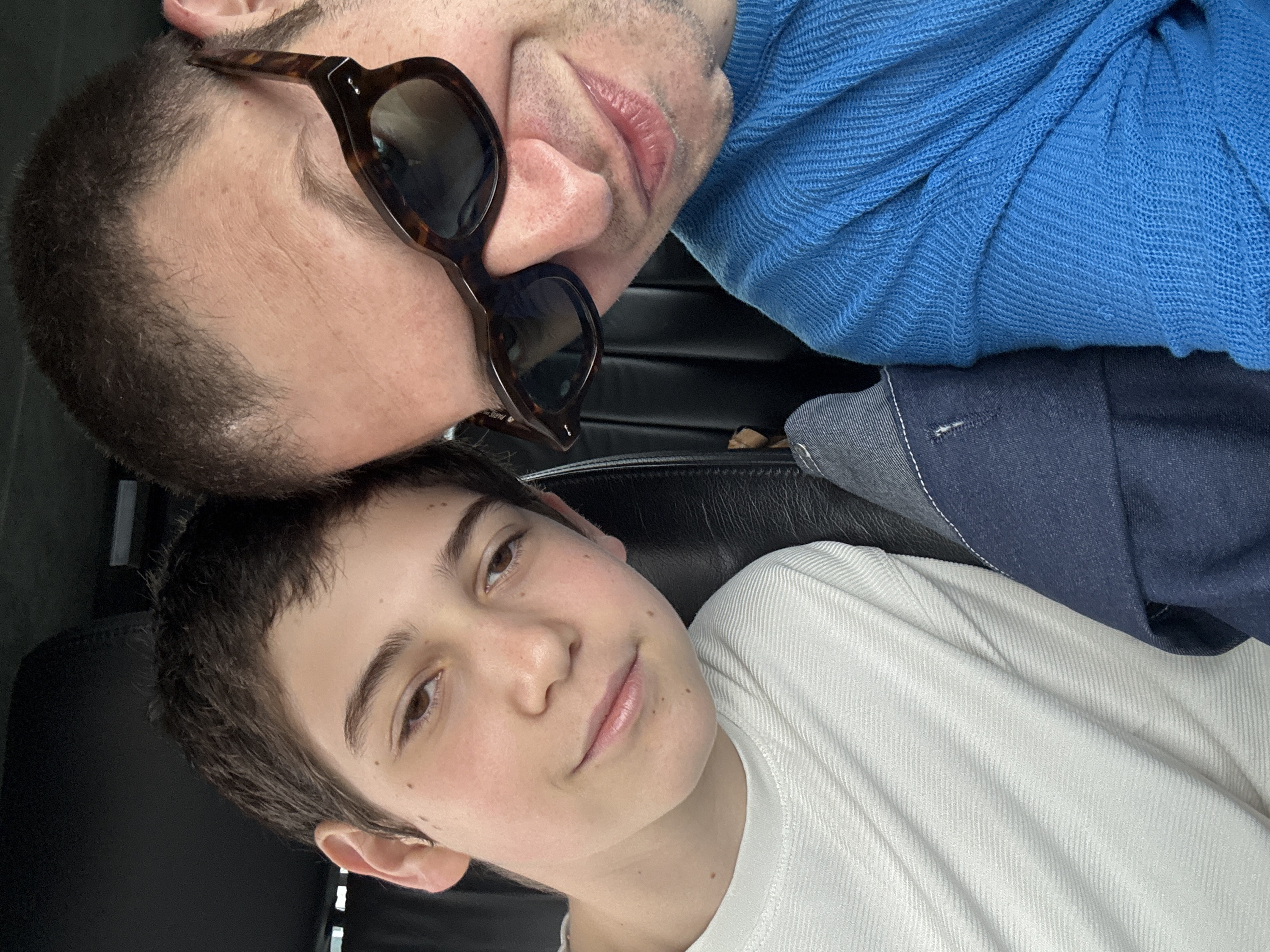 The image displays a close-up portrait of two individuals, appearing to be male, in an interior environment, likely a vehicle cabin, characterized by dark upholstery visible in the background. No specific visual details within the image indicate a location in Como, Italy. The individual on the left is younger, with fair skin, short dark brown hair, and brown eyes. He exhibits a slight smile and is wearing a white, textured long-sleeved shirt with horizontal ribbed patterns. The individual on the right is older, with fair skin, very short dark hair, and visible stubble on his face. He is wearing dark tortoise-shell sunglasses, which partially obscure his eyes, with the word "PARIS" faintly visible on the inner arm of the frame. He also displays a slight smile and is dressed in a blue, textured long-sleeved shirt or sweater. The heads of both individuals are leaning together, indicating close physical proximity. A dark blue fabric garment, possibly denim, with visible white stitching, is present between and below the individuals.