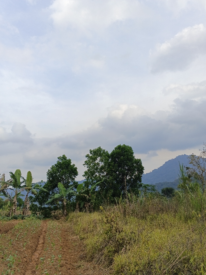 The scene depicts a rural agricultural landscape in the vicinity of Chengdu, China, under an overcast sky. The foreground on the left consists of tilled brown earth with distinct parallel furrows and small green plant sprouts. Adjacent to this on the right, the ground is covered with wild grasses and low-lying vegetation in varying shades of green and yellow. In the midground, a line of several banana trees with large green leaves is visible on the left, transitioning to a cluster of dense, dark green broadleaf trees towards the center-right. The background features a series of bluish-grey mountains or hills, heavily vegetated. The sky is largely covered by diffuse grey and white clouds. No human activity or man-made structures are observed.