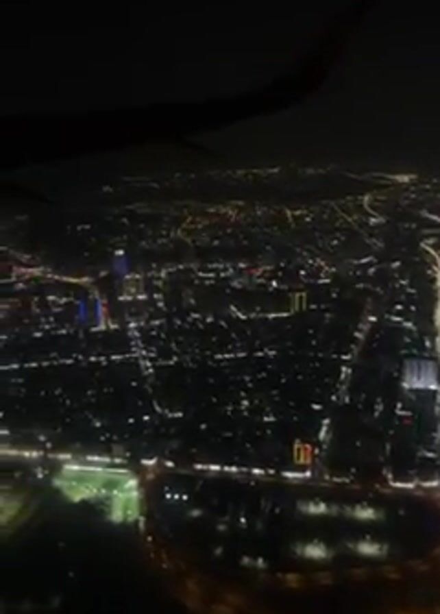 view from an airplane window at night. The wing of the plane is visible in the upper left corner of the frame. Below, there is a sprawling cityscape illuminated by thousands of lights, indicating roads, buildings, and infrastructure. The city is dense, with areas of concentrated light and stretches of darkness in between. Traffic can be seen flowing on the highways. The overall scene captures a nighttime aerial view of a large city.