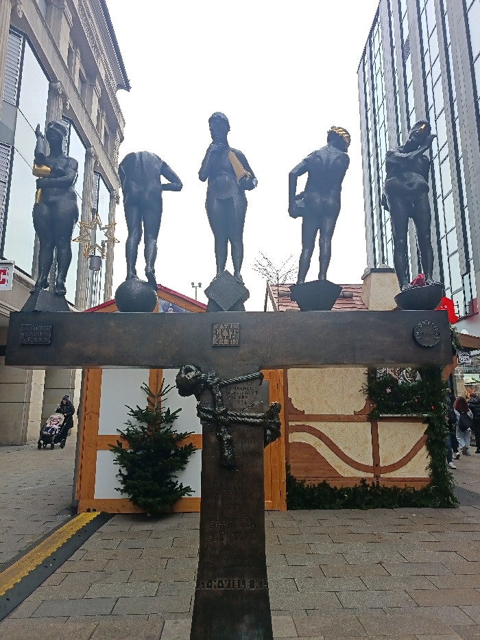 This image captures the "Messe-Männchen" (Fair Monument) sculpture situated on Richard-Wagner-Platz in Leipzig, Germany, an urban pedestrian zone. The central bronze monument consists of a vertical plinth, partially obscured, which supports a horizontal crossbeam. This crossbeam, bearing plaques with text such as "SATIE NATU KEBIN," supports five individual nude male figures. From left to right, the figures are: a figure holding a golden object with a raised arm; a headless figure standing on a sphere; a figure holding a golden sash across its chest; a figure bent forward with golden hair; and a figure leaning dramatically, holding a golden object near its face. Some figures exhibit golden accents on their bodies or objects. In the midground, behind the monument, temporary wooden market stalls are visible. These stalls are decorated with green fir garlands, indicating a festive market setting. One stall features a light-colored facade with brown timber-frame detailing. A small, evergreen fir tree stands on the paved ground between the monument's plinth and a market stall. The background on the left features a multi-story building with a classical facade, large windows, and a decorative star hanging in front. On the right, a tall, modern building with a grid pattern of glass windows is visible. The foreground consists of paved stone, with a yellow and black striped curb or ramp on the far left. On the left side of the scene, a person in dark clothing pushes a baby stroller containing a child. On the right, several indistinct pedestrians are present near the market stalls. The overall lighting is diffuse, suggesting an overcast sky.