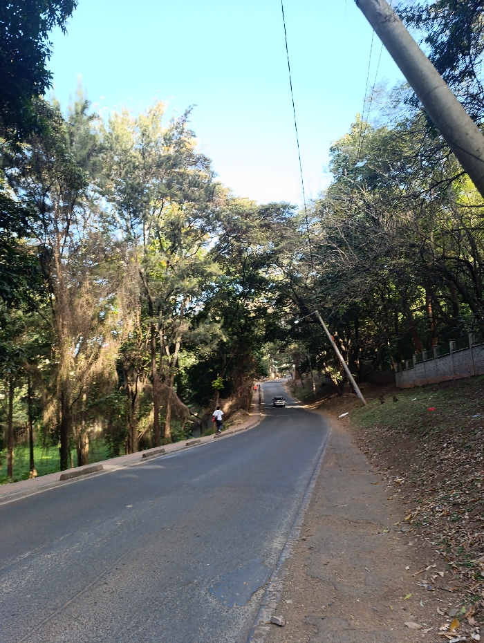 The image depicts a tree-lined, asphalt road within the city of Nairobi, Kenya, under a clear blue sky. The road slopes gently downward and curves to the right in the mid-ground. A single light-colored sedan is observed driving away from the viewer in the distance, partially obscured by the road's curve. On the left side of the road, a pedestrian wearing a white shirt and dark trousers walks away from the camera, positioned on the road's shoulder near a raised concrete curb. The left side of the road is bordered by a steep, densely vegetated embankment featuring numerous trees with varied foliage and some hanging, vine-like structures. The right side of the road features a dirt and gravel shoulder, a grassy slope covered with fallen leaves, and a low, grey stone wall in the mid-ground. A light-colored utility pole with overhead power lines is prominently visible on the right side of the foreground, leaning slightly towards the road. The scene is brightly illuminated by natural daylight.