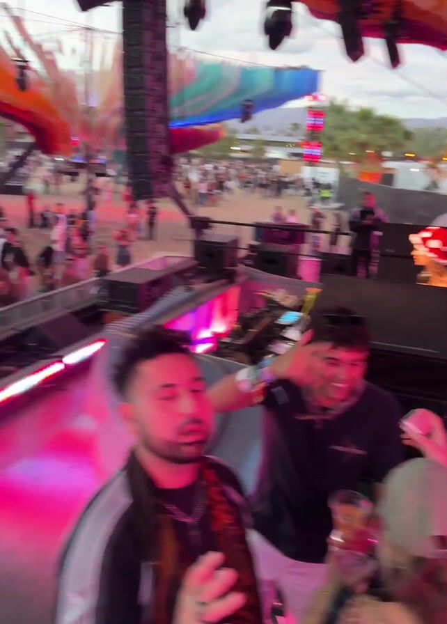 n outdoor music festival with a large crowd of people. The camera pans from a group of people on stage to show the audience in front of the stage. The stage is decorated with colorful flags and lights. There are speakers and other equipment on the stage. The audience is made up of people of all ages and backgrounds. They are all dressed casually and are enjoying the music.