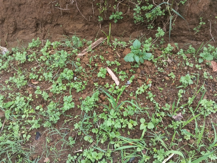 This image presents a close-up, downward-angled view of an area of disturbed reddish-brown soil, located in Banteay Srei, Cambodia. The ground is largely covered by various stages of emergent vegetation. Numerous small, light green herbaceous plants with deeply lobed or compound leaves dominate the foreground and midground, interspersed with blades of green grass. Towards the top center-right, a singular, more mature plant with broad, ovate-to-cordate leaves and visible venation stands distinctly taller than the surrounding growth. A pale, elongated object, appearing to be a dried root or a small piece of wood, lies horizontally on the soil in the upper-middle left. The upper left portion of the frame reveals a darker, compacted soil bank or raised earth. The scene is static, devoid of any human presence or active subjects.