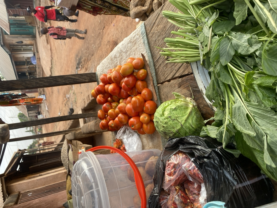 An outdoor market displays a variety of produce. A pile of ripe tomatoes sits next to a head of cabbage and leafy green vegetables. Below these are a clear plastic container with a red handle and a black plastic bag filled with red peppers. The scene is slightly rotated, showing blurred figures walking past market stalls in the background.