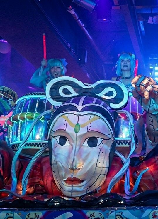 This image depicts a theatrical performance scene, likely within the Robot Restaurant, located in Shinjuku, Japan. The foreground is dominated by a large, stylized mask or head sculpture. This sculpture features a pale face with prominent black eyes, red lips, and a green oval gem on its forehead, along with patterned lines on its cheeks. It wears an ornate black and purple headdress with two white, loop-shaped decorations, and its base is covered in red and orange fabric. Behind and to the left of the sculpture, a female performer with short, bright blue hair and a broad smile is visible. She holds two glowing red batons high above her head, positioned behind a large, illuminated drum-like object that glows blue with yellow accents. To the right of the sculpture, another female performer with similar bright blue hair stands, looking forward with a subtle smile. She wears a decorative top with a prominent, golden-orange mechanical arm attachment. The environment is an indoor stage setting, heavily saturated with dramatic blue and purple lighting, suggesting the use of fog or haze. Overhead, multiple stage lights and structural elements of the venue are visible, emitting intense blue light downwards. The overall scene conveys an energetic and highly visual stage production.