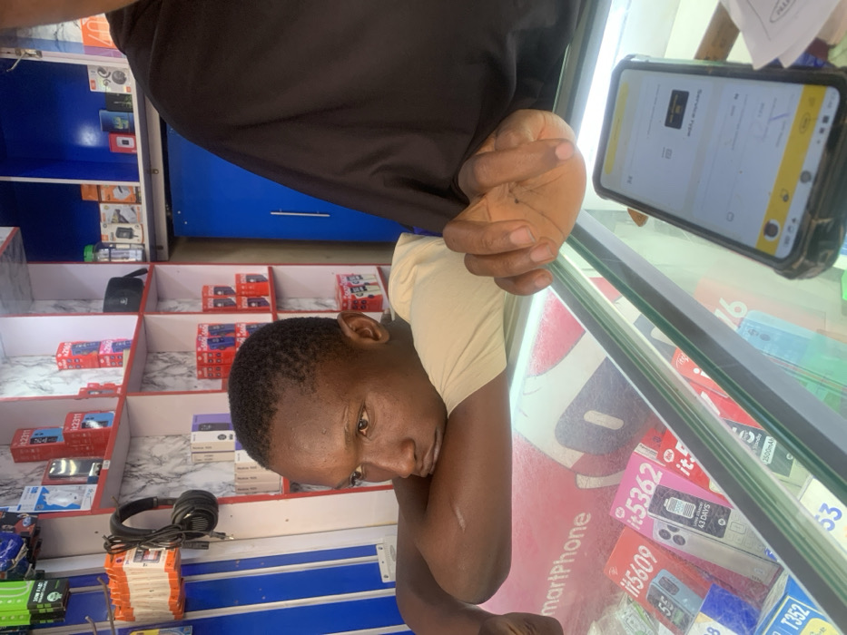 The image depicts an interior scene within a mobile phone and electronics shop in Akwanga, Nigeria