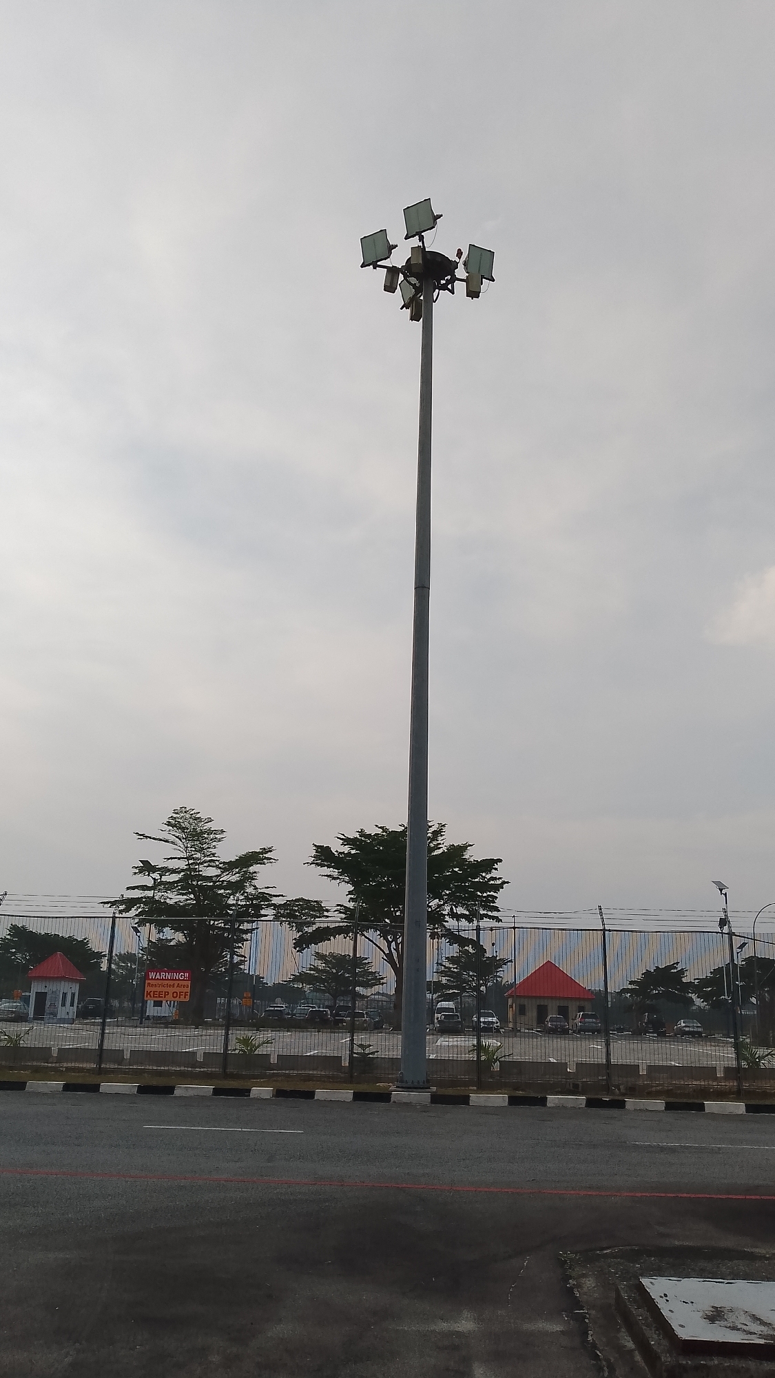 The image depicts an outdoor scene in Orerokpe, Nigeria, under an overcast sky. A tall, grey metal light pole, equipped with six rectangular floodlights mounted radially at its top, stands centrally. In the foreground, a dark asphalt road features a black and white striped curb and a thin red line painted horizontally. To the far right, a metal manhole cover is partially visible on the ground. Behind the road, a black metal fence topped with barbed wire runs horizontally, separating the foreground from a paved area. A yellow and red sign attached to the fence on the left reads, "WARNING!! Restricted Area KEEP OFF." Behind the fence, numerous vehicles are parked on a paved lot. Two small, single-story buildings with red gabled roofs and light-colored facades are visible within this fenced area: one on the left, and another further back on the right. Multiple dark green trees, some appearing coniferous, are scattered throughout the fenced area and behind the buildings. No individuals are present in the scene, and no overt actions or interactions are depicted.