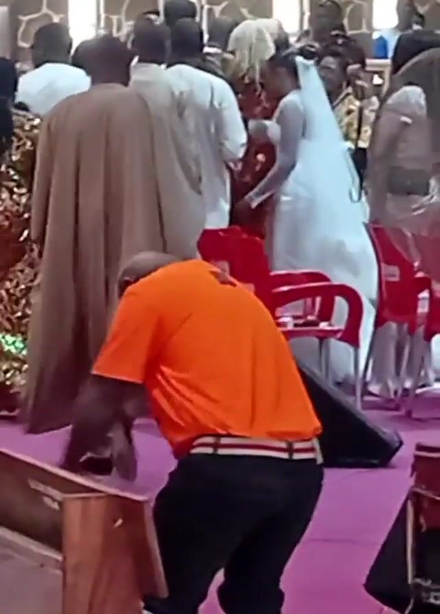wedding ceremony in what appears to be a church. A bride in a white dress stands on a purple carpet, surrounded by people dressed in traditional African attire. A man in an orange t-shirt with black pants and a white belt is seen from the back, standing among the church pews. The church interior features stone walls and stained glass windows.