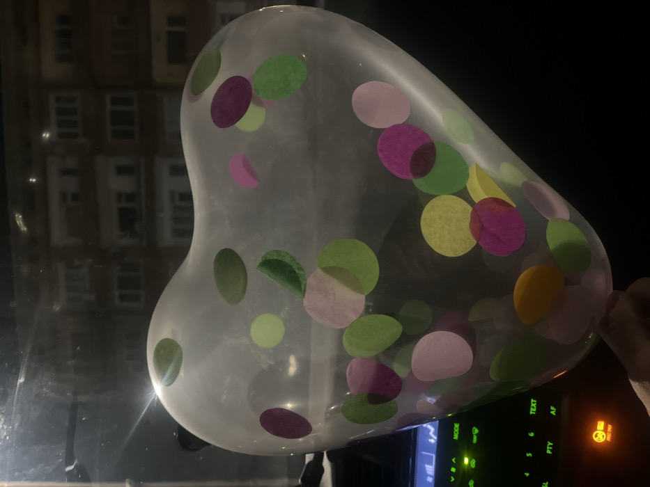 - "A transparent, heart-shaped balloon, filled with circular confetti in green, pink, purple, yellow, and orange hues, is held by a human thumb visible at the bottom left" by FM-JSWnl2, licensed under CC BY 4.0