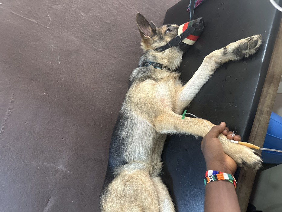 A German Shepherd dog, bicolored with tan and black fur, is observed lying on its right side on a black examination table within a veterinary setting, identified as being in Aba, Nigeria. The dog's eyes are open, and its ears are semi-erect. A black collar is visible around its neck. A muzzle, primarily black with a red, green, and white striped fabric band, is fitted over the dog's snout. A green butterfly catheter is inserted into the dog's left front leg, connected to an intravenous (IV) line, indicating fluid administration. A dark-skinned human hand, adorned with a multicolored beaded bracelet (featuring white, orange, green, blue, and black beads), gently holds the dog's left front paw. The background consists of a plain, textured brown wall. A partial blue object is visible underneath the examination table.