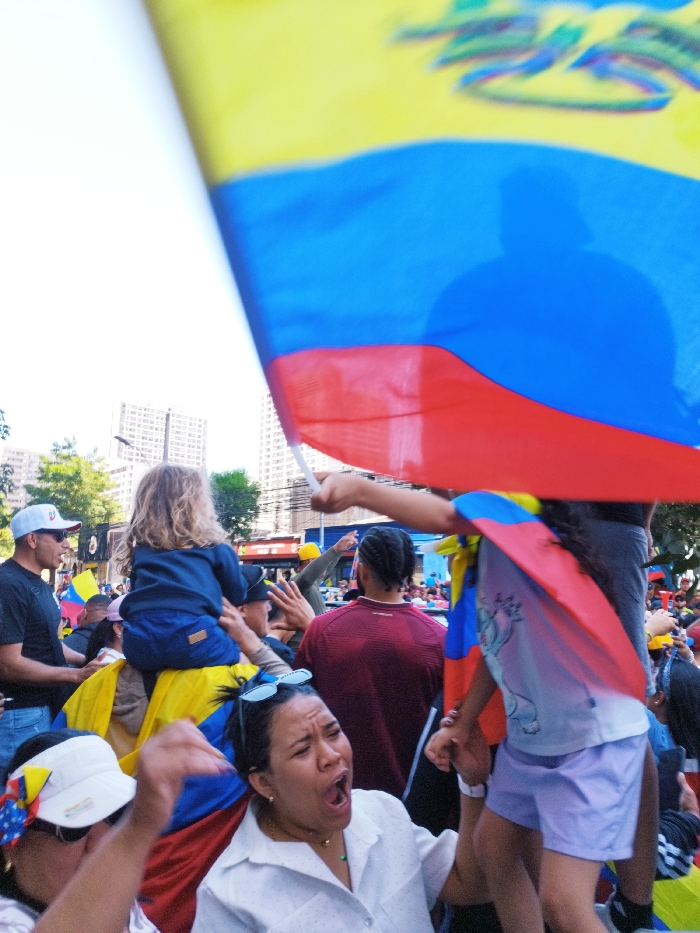 The image depicts a crowded outdoor gathering in Santiago, Chile, characterized by a vibrant display of South American tricolor flags. In the immediate foreground, a large yellow, blue, and red flag, consistent with the national flags of Colombia or Ecuador due to the wider yellow stripe, occupies the upper right portion, held aloft by an unseen individual whose arm is visible on the right. A shadow of a person's head and shoulders is cast upon the flag's blue band. The midground is densely populated with individuals engaged in various activities. On the left, a man wearing a white baseball cap with a red brim and a black t-shirt smiles towards the left. Central to the composition is a young child with light, curly hair, wearing a dark blue top and blue pants, seated on the shoulders of an adult. Below the child, a woman with dark hair and sunglasses perched on her head is captured with her mouth wide open, looking upwards, possibly shouting or singing. She wears a white collared shirt and a small green necklace. To the right of the child, a young person in a white t-shirt with a blue graphic and light purple shorts is partially visible, holding a smaller version of the same yellow, blue, and red flag over their shoulder. Other individuals in the crowd include a man with braided hair in a reddish-brown shirt and another person wearing a yellow hard hat in the distant background. Numerous smaller flags of the same design are interspersed throughout the crowd. The background reveals an urban environment with multiple tall, light-colored buildings under a bright sky, suggesting a city center or commercial district. Overhead power lines or cables are visible, and sparse foliage from trees is present on the left, indicating an outdoor setting.
