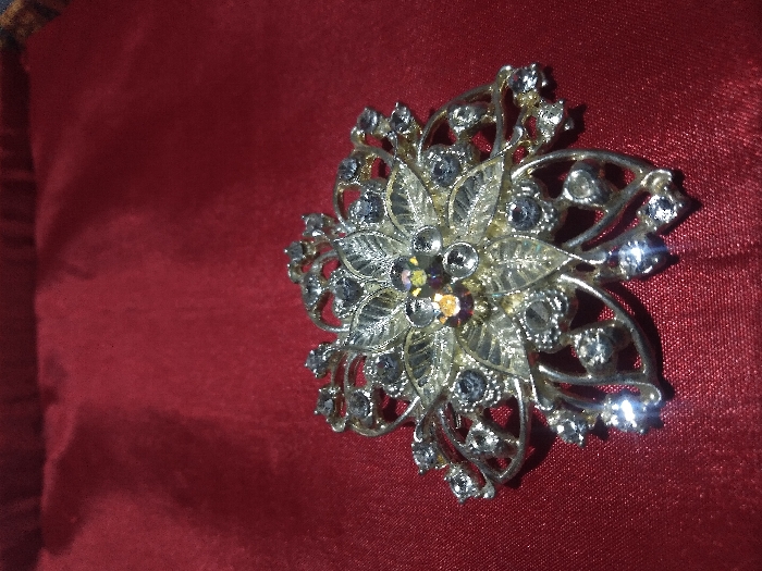 A silver-toned, ornate brooch with a floral-snowflake motif is centrally depicted, resting on a deep red fabric background
