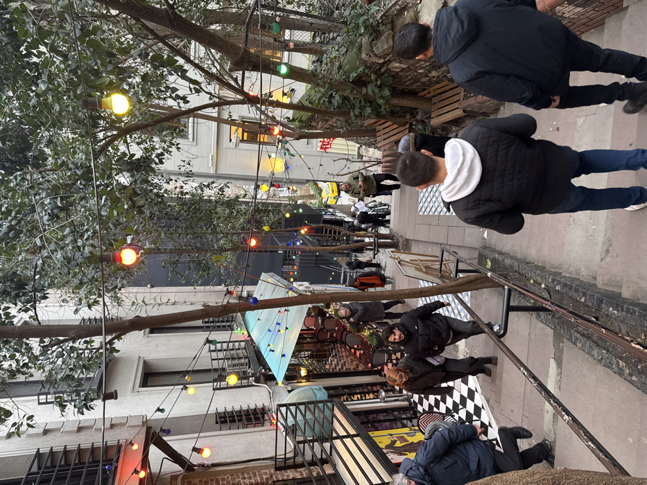 The image displays a steep, pedestrian-only stone staircase within Beyoğlu, Turkey, descending between urban buildings. Overhead, multiple strings of illuminated, multi-colored light bulbs (red, yellow, green, blue) form a canopy. Trees with sparse green foliage and bare branches line the pathway, particularly on the right, where wooden benches are integrated into a stone wall. On the left, a light-colored building features a ground-floor commercial establishment, likely a cafe, with a light blue awning extending over an outdoor seating area. This area is characterized by black and white checkered floor tiles, red chairs, and small tables. Below this, a storefront with yellow and black graphics is partially visible. Black metal railings flank both sides of the staircase. Approximately fifteen individuals are present on the steps. In the immediate foreground, two men descend with their backs to the camera; one wears a black puffer jacket over a white hooded sweatshirt, blue jeans, and white sneakers, while the other wears a dark jacket and dark pants. In the midground, a couple ascends; the woman wears a dark jacket and pants, and the man next to her wears a black puffer jacket. Further up, various other pedestrians are visible, some walking, others standing. One man in an olive-green jacket is observed looking at a mobile phone. At the top of the steps, a yellow taxi cab is visible, indicating a street beyond, and bicycles are parked near the top left of the staircase.