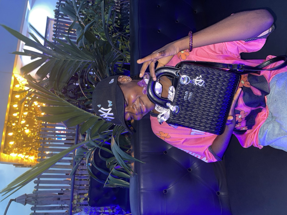 A person wearing a black baseball cap and a pink and orange floral shirt is sitting on a black leather sofa. They are holding a black Miu Miu purse with decorative embellishments. Palm trees are visible in the background along with an outdoor structure with lights. The person is also wearing a purple beaded bracelet.