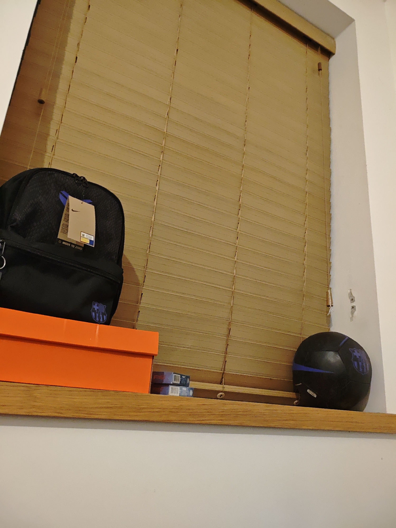 A still life is composed of a black backpack with a tan tag on top of an orange Nike shoebox; two small, blue boxes; and a black soccer ball, all sitting on a wooden window sill. The background consists of a closed, light brown, horizontal slat blind. The location is Swindon, United Kingdom. No people are present.