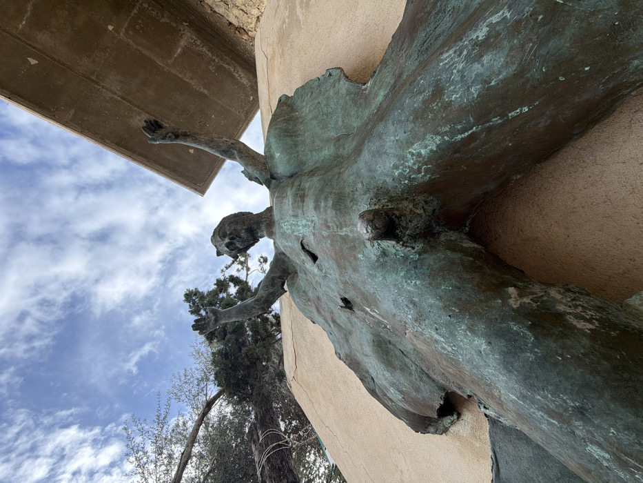- "A large, weathered bronze sculpture of a nude male figure is depicted, mounted vertically against a light tan, textured wall under a partly cloudy blue sky" by FM-PcEqo1, licensed under CC BY 4.0
