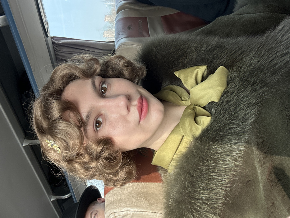 A female individual, estimated in her 20s or 30s, is centered in a close-up selfie taken inside a King Long brand passenger bus, presumed to be in Huangdao District, China. She possesses fair skin, brown eyes, and light brown hair styled in voluminous curls with a gold-toned, leaf-shaped hair clip adorned with clear stones on the right side of her head. Her lips are coated with pink lipstick. She wears a golden-olive green satin blouse featuring a large bow tied at the neck, overlaid by a dark olive-green fur coat or stole. Behind her, the upper portion of a second individual, wearing a dark brimmed hat, is partially visible. The bus interior features beige and brown upholstered seats, an overhead compartment, and a window with a drawn curtain. Through the window, a clear blue sky, distant low-rise buildings, and sparse trees are visible, indicating an exterior environment.