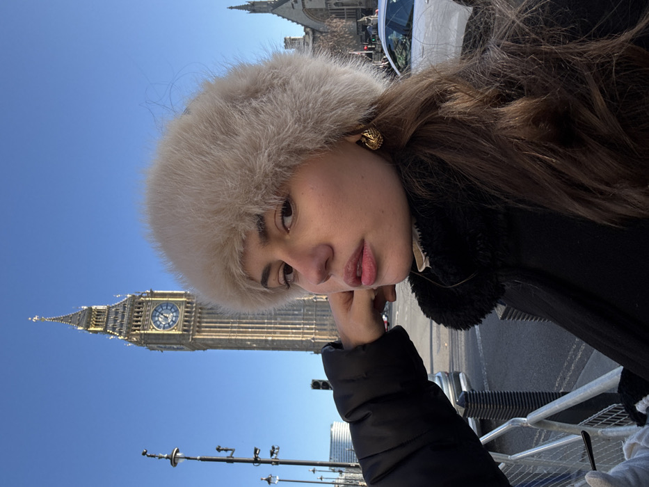 The image presents a posed portrait of a young adult female in the foreground, situated in Westminster, London, United Kingdom
