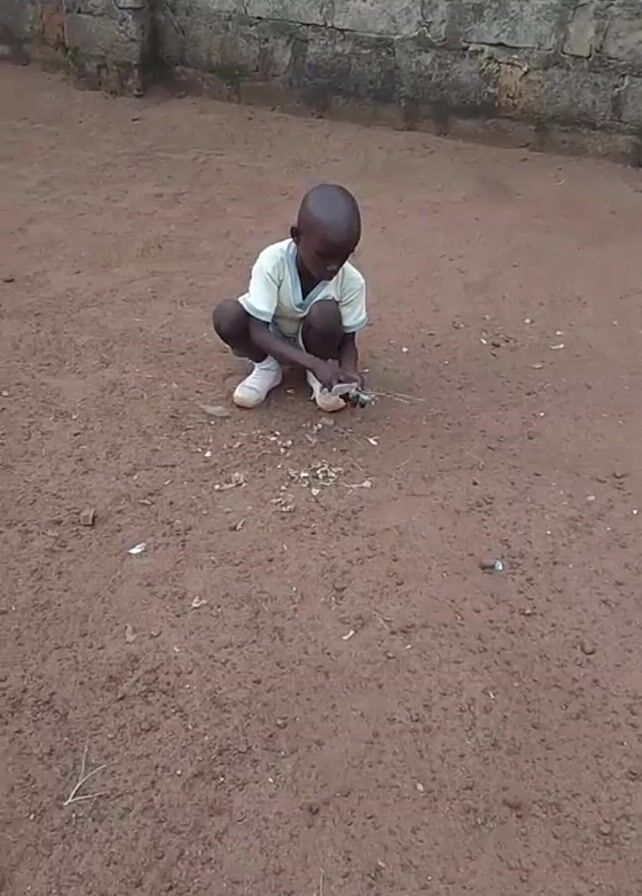 A young child squats on the ground, surrounded by what appears to be scattered bits of trash. The child is dark-skinned, wearing a light-colored shirt and shorts, and white sneakers. The ground is a reddish-brown dirt surface. Behind the child is a rough, concrete block wall. The child manipulates something in their hands, then reaches out to pick up a small piece of trash from the ground. The sound of singing can be heard in the background.