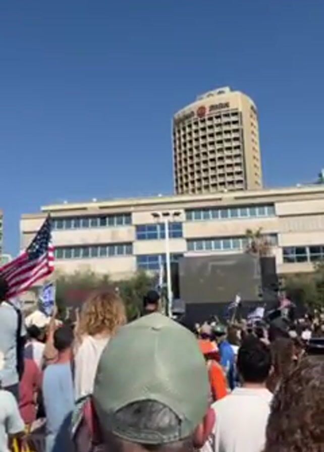 The video captures a crowd gathered outdoors under a clear blue sky, possibly at a rally or demonstration
