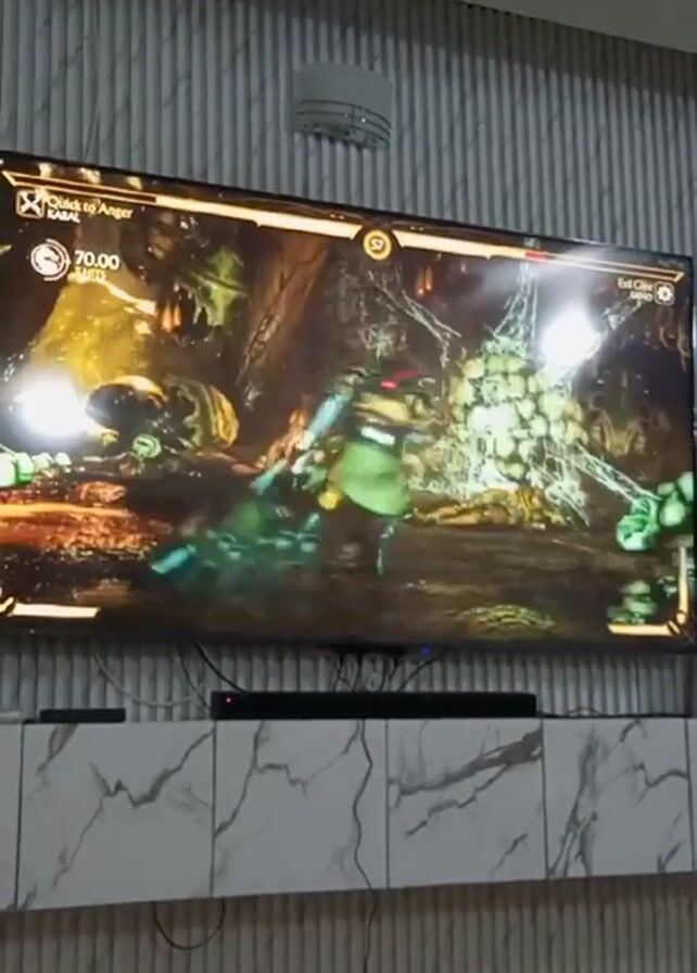 Here's a detailed description of the video: The video shows someone playing Mortal Kombat on a large flat screen television mounted on a wall. The game is in progress, and two characters are engaged in combat in a dark, swampy environment with lush green vegetation and some kind of web or netting. The health bars of both characters are visible at the top of the screen along with other game information. The TV is mounted above a white, marble-patterned console. The wall behind the TV has a vertical ribbed design and is painted in a light grey color. There is a circular light fixture mounted on the ceiling.