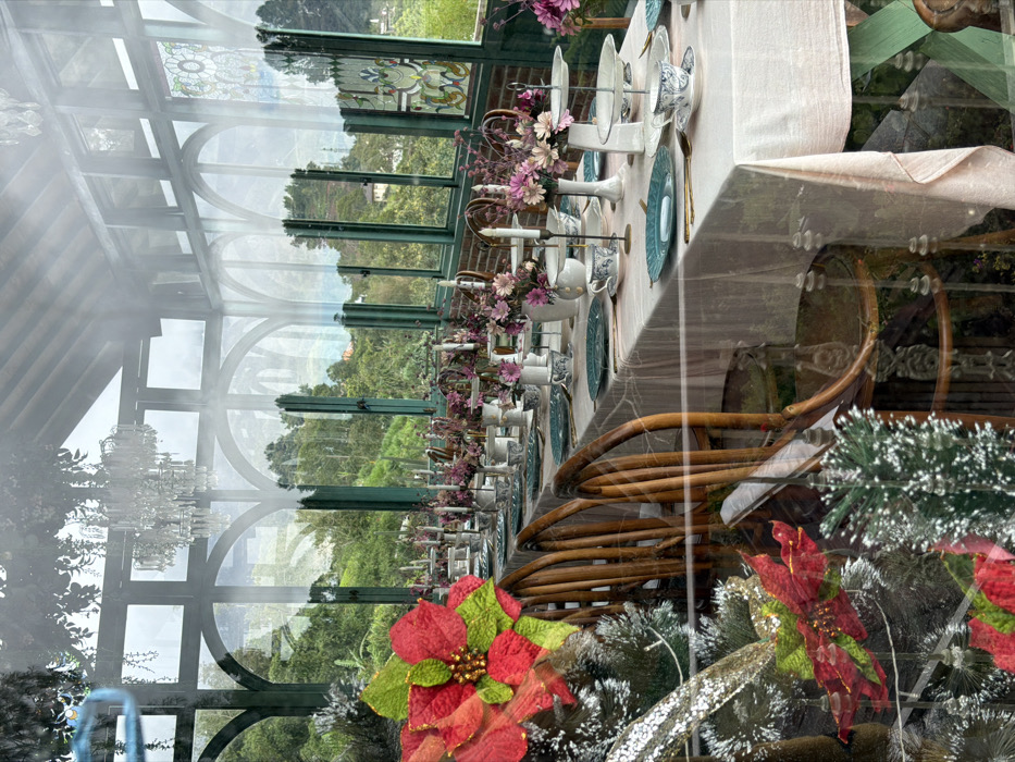A long table set with fine china and floral arrangements stretches through a glass-walled veranda. Green foliage is visible outside the glass. Wicker chairs are positioned around the table. A Christmas decoration featuring poinsettias and artificial greenery sits near the viewer, partially obscuring the table setting. The veranda structure includes arches and a glass ceiling reflecting an outdoor scene.