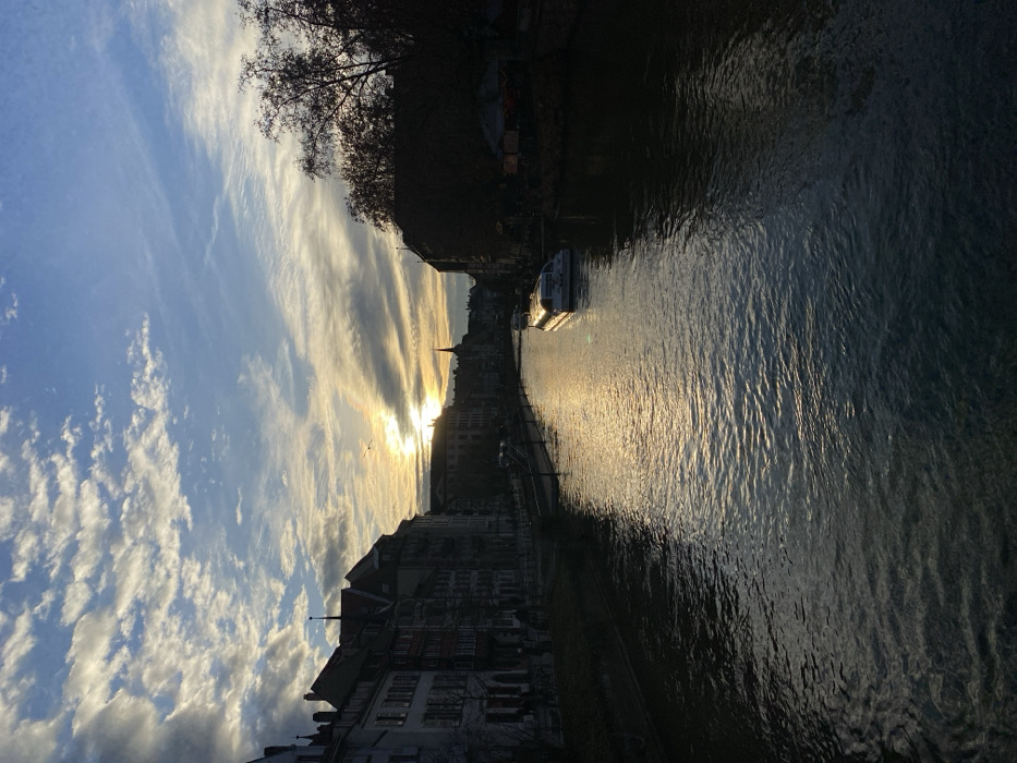 This image captures a wide-angle view of a canal in Strasbourg, France, identified as a branch of the Ill River, likely within the historic Grande Île or Petite France district. The perspective is directed along the waterway, observed during either sunrise or sunset, with the Strasbourg Cathedral spire visible in the distant cityscape. The sky occupies the upper two-thirds of the frame, displaying a gradient from a pale blue zenith to a luminous golden-orange at the horizon, where the sun is partially obscured by horizontal cloud formations. Altocumulus and cirrocumulus clouds are present across the sky. The canal fills the lower third of the image, its surface exhibiting ripples and reflecting the sky's light. A prominent golden-orange specular reflection from the sun extends centrally towards the foreground over the water. The left bank features a continuous line of multi-story, traditional European-style buildings with pitched roofs and visible window apertures, largely silhouetted against the brighter sky. Sparse deciduous trees with bare branches line this bank. The right bank displays a similar architectural profile, with buildings appearing as darker silhouettes. A large, deciduous tree with denuded branches is prominent on this side, and a small, indistinct structure is partially visible closer to the water's edge. A single white, flat-topped tour boat is positioned in the mid-ground of the canal, oriented away from the viewer, its upper surfaces illuminated by the sun's reflection. In the distant background, a prominent, slender church spire, identified as that of the Strasbourg Cathedral, rises above the generalized urban skyline. No human figures are discernible in the scene.