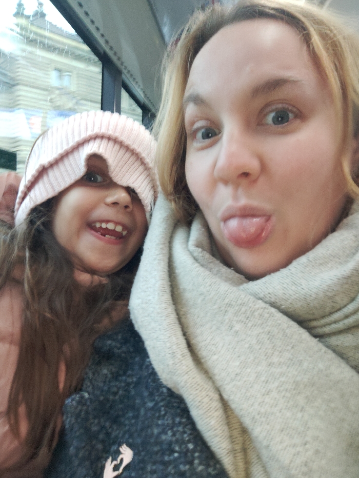 A selfie depicts an adult female and a young female child within the interior of what appears to be a public transport vehicle